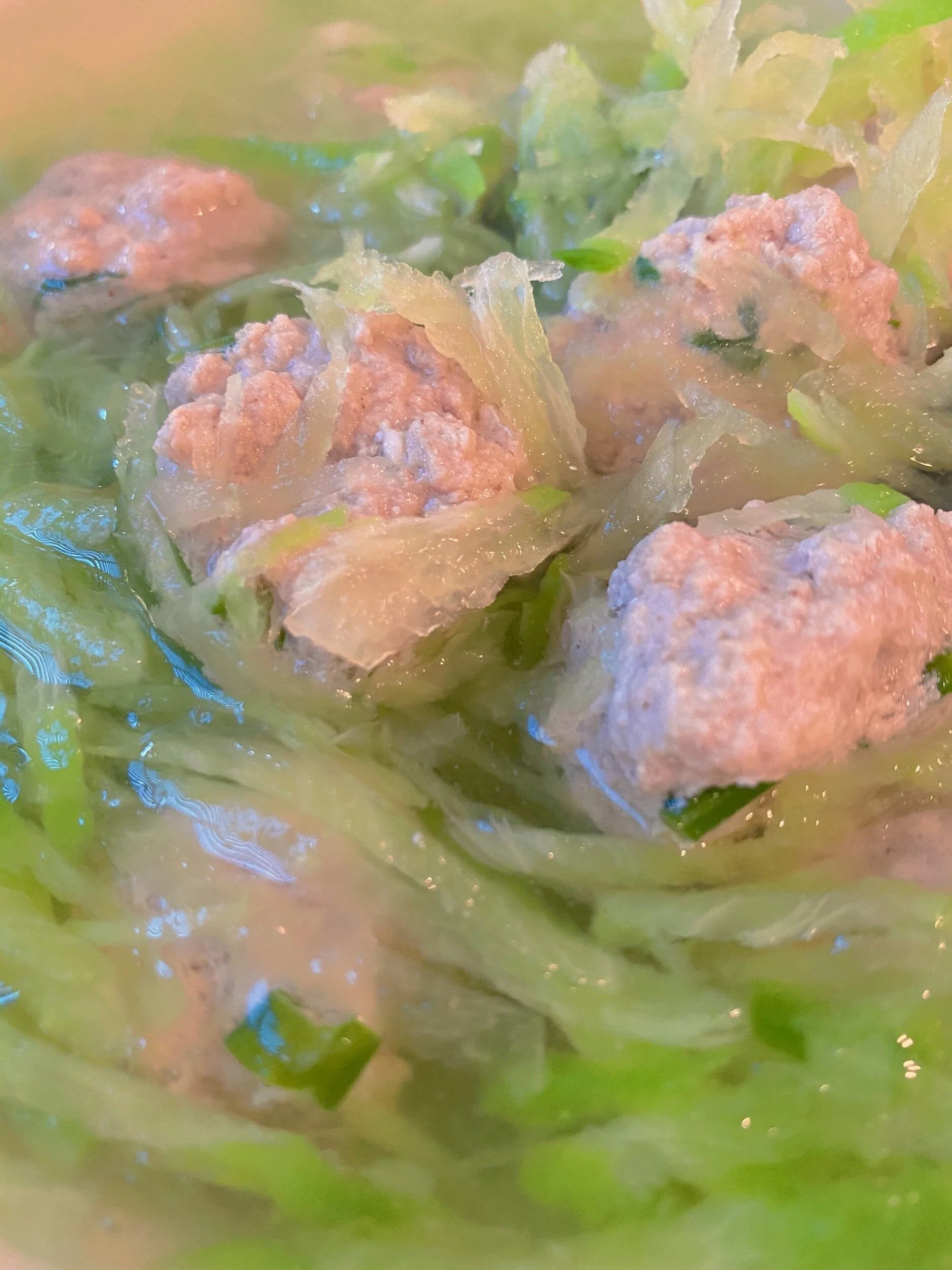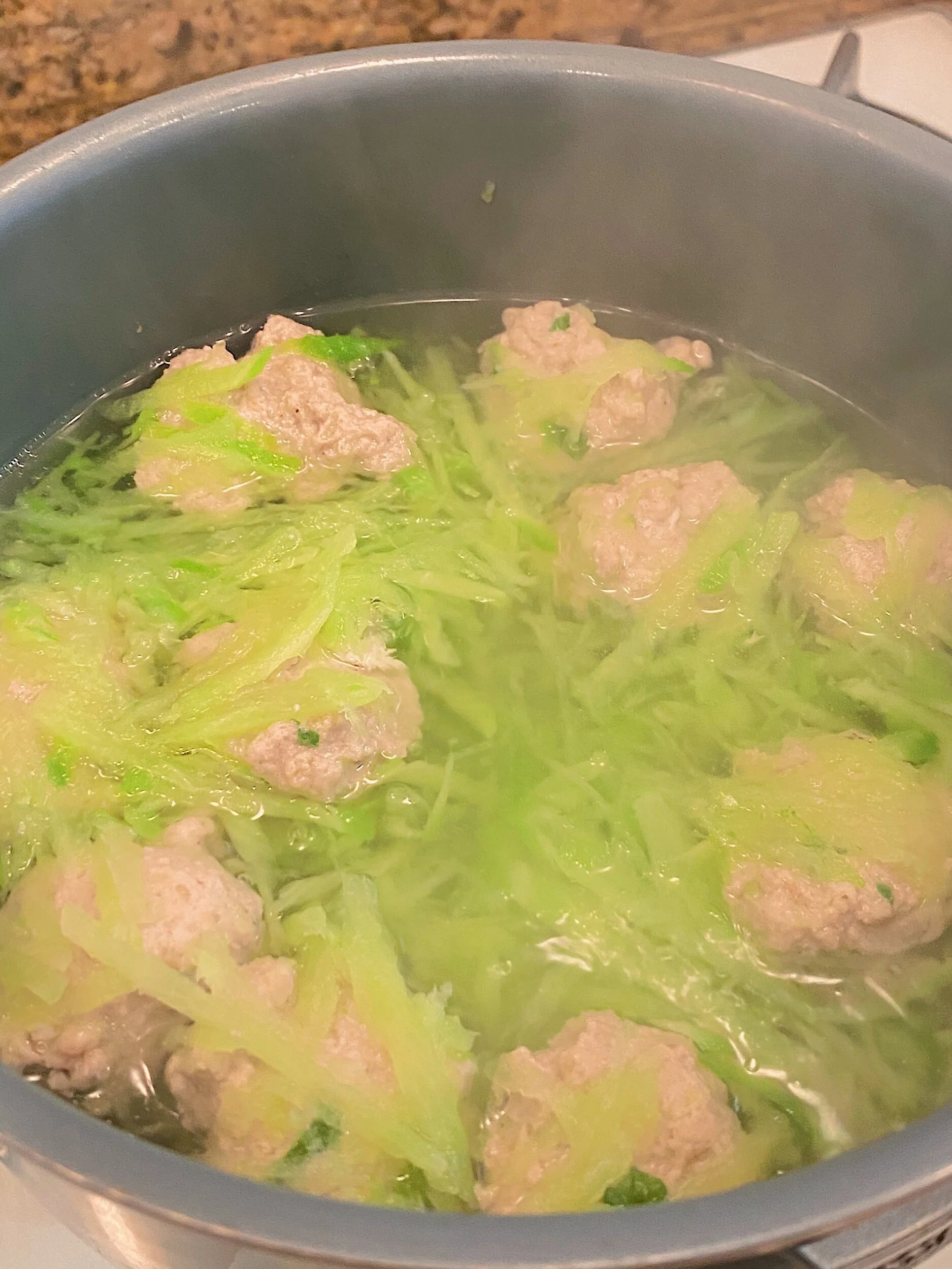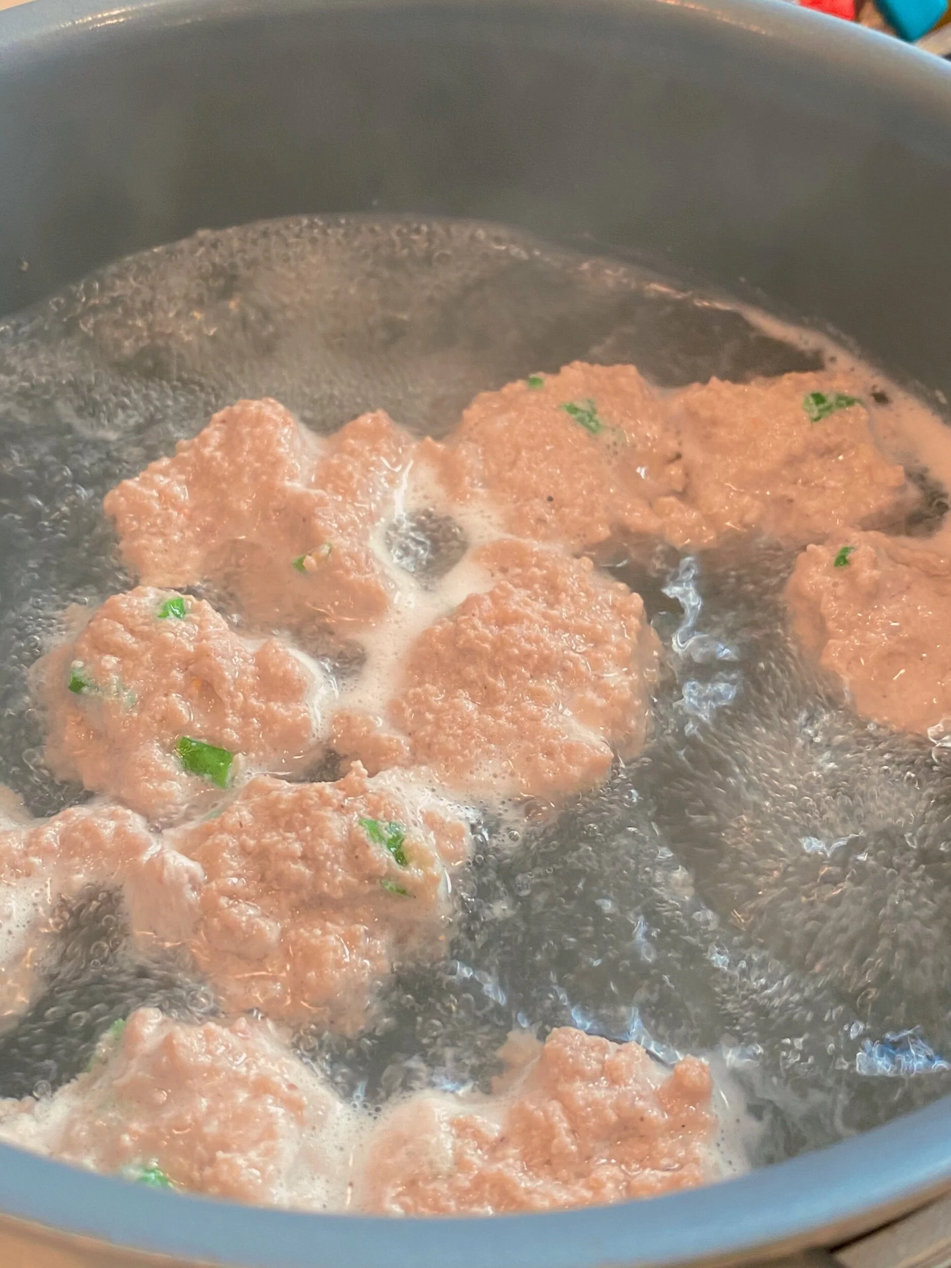 3. Meanwhile, boil a pot of hot water. Pinch off about 1 and 1/2 tablespoon of the meat mixture per meatball, and form into balls. Place the meatballs into the boiling water over medium-high heat for 4-5 minutes. Skim off the white scum on the surface of the soup.